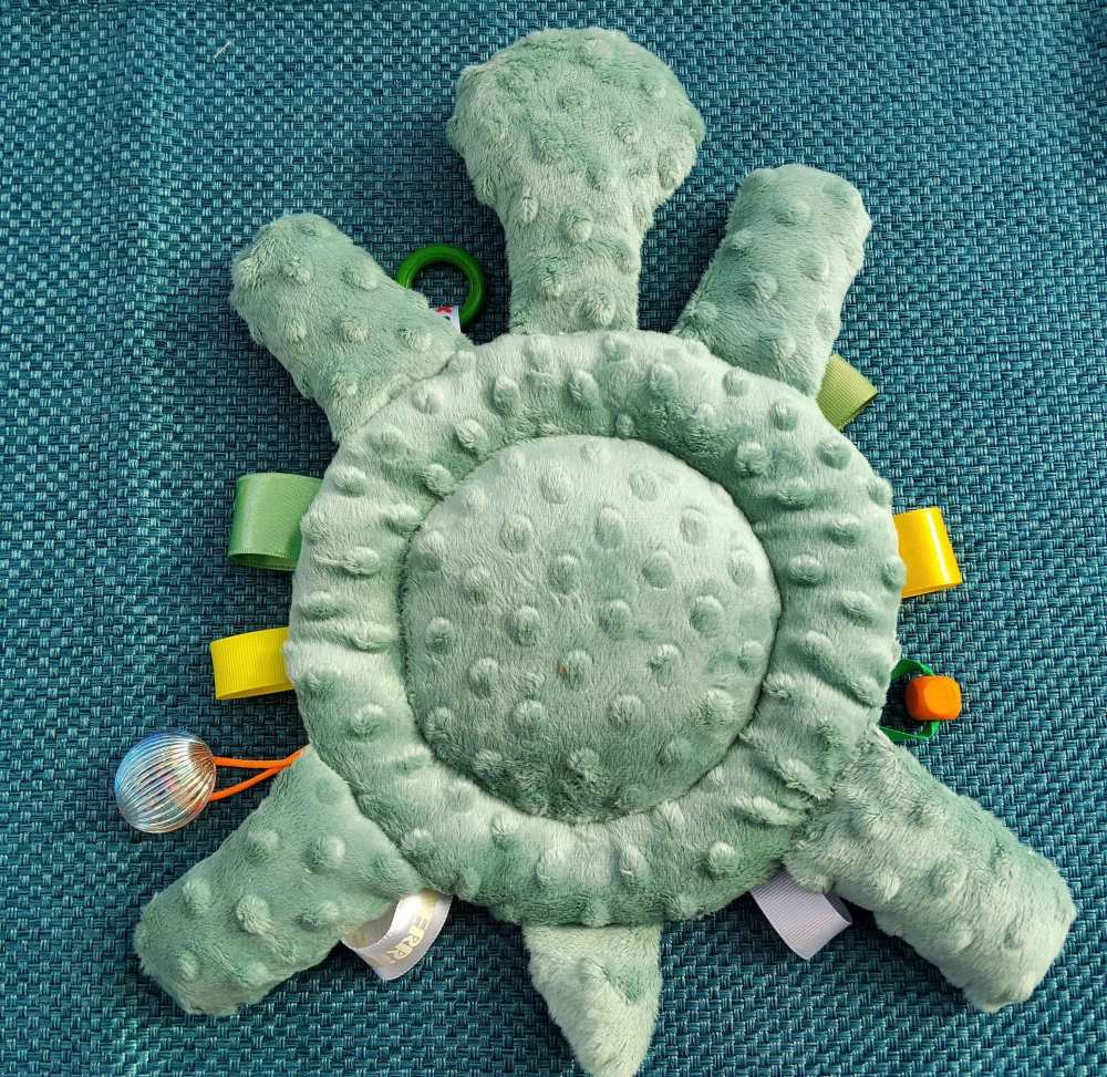 Ez a tündéri kis teknős, már a legkisebbek figyelmét is könnyen magára vonja. Pihe-puha testtel és egy sípolóval a páncélja alatt, készen áll a legjobb barátja lenni gyermekednek. :) Sok színes szalag, gyöngy, karika, gomb, zsinór, várja az apró ujjacskákat.