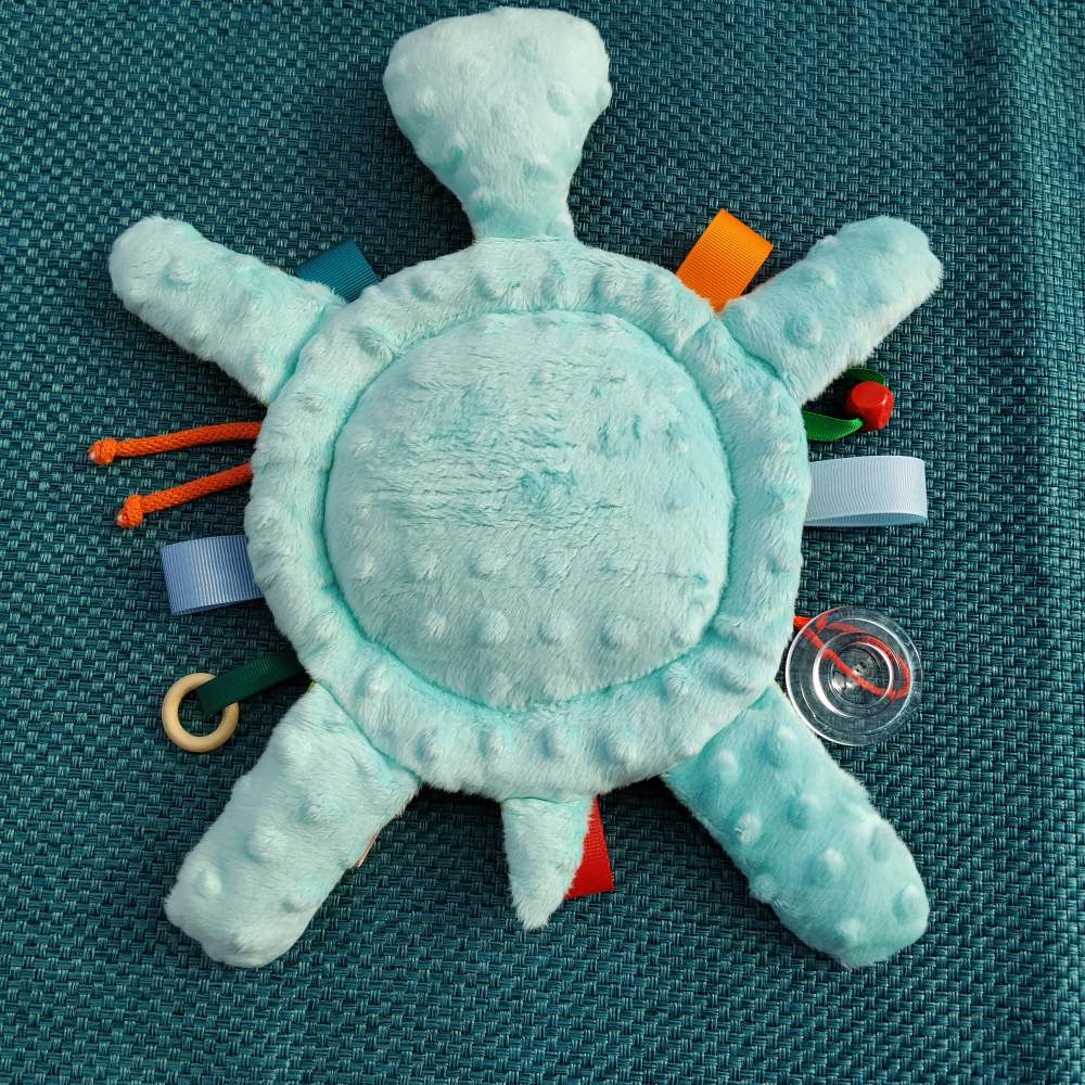 Ez a tündéri kis teknős, már a legkisebbek figyelmét is könnyen magára vonja. Pihe-puha testtel és egy sípolóval a páncélja alatt, készen áll a legjobb barátja lenni gyermekednek. :) Sok színes szalag, gyöngy, karika, gomb, zsinór, várja az apró ujjacskákat.